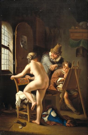 van zijn hand: 'De schilder arbeidt aan zijn ezel naar een naakt vrouwenmodel,'